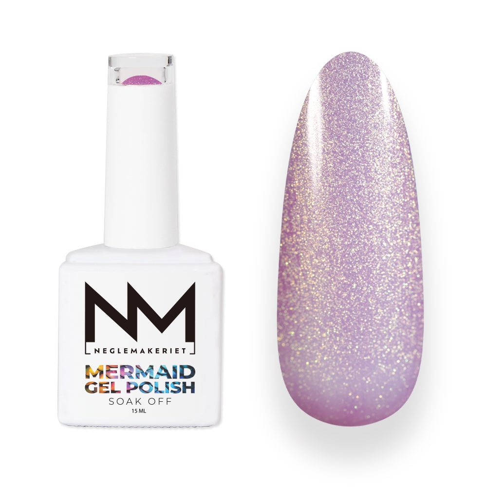 La neglene dine skimre som en havfruehale! Vår Mermaid Gel Polish har en fortryllende iriserende effekt. Denne fargen (#01) skifter mellom myke smått kjølige rosa nyanser, perfekt balansert med et subtilt skimrende gullglitter som fanger lyset vakkert.