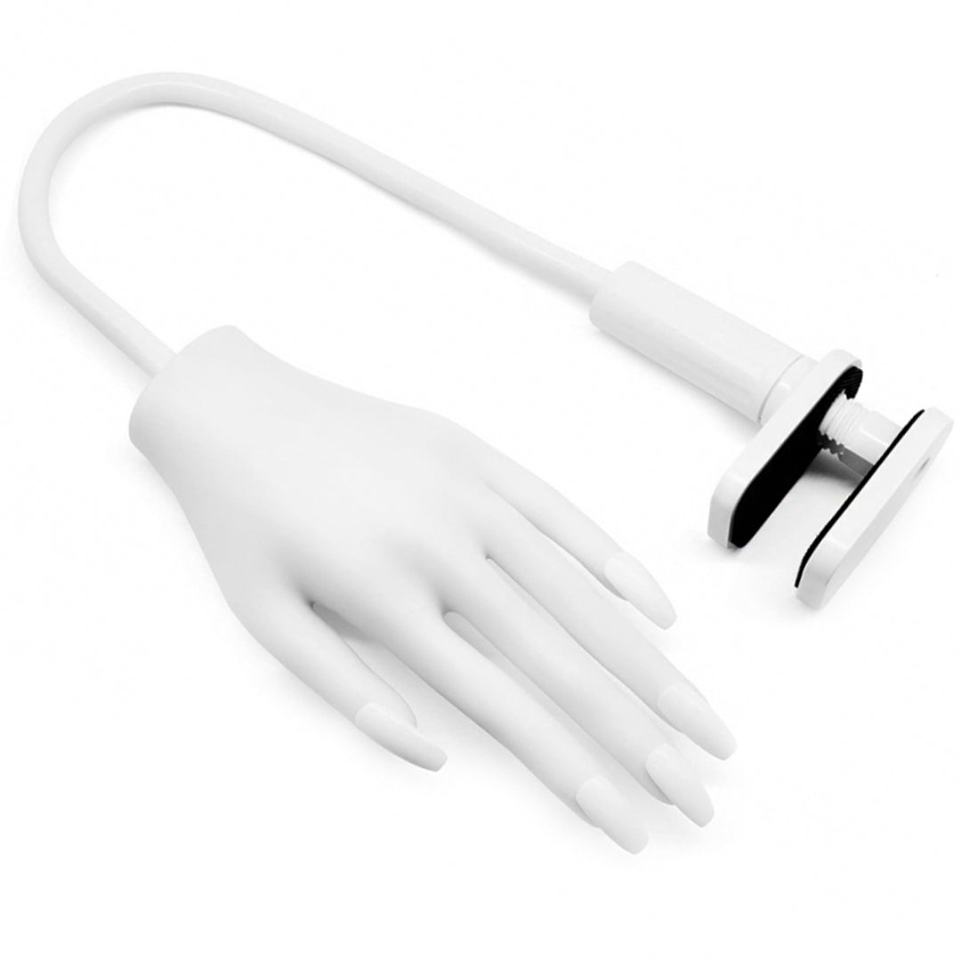 Sterk og stabil kunstig hånd i naturlig størrelse, med fingre som kan bøyes i alle retninger. Hånden festes enkelt på bordplaten med en skrutvinge, og den fleksible bøylen gjør at du kan få den i riktig posisjon mens du i ro og mak øver på å legge gelenegler, akrylnegler, dekor eller annen kunstnegl. De 50 medfølgende avtagbare neglene sitter godt, og kan brukes om og om igjen. De løse negletippene festes uten lim, de skyves på plass i et spor i fingeren.