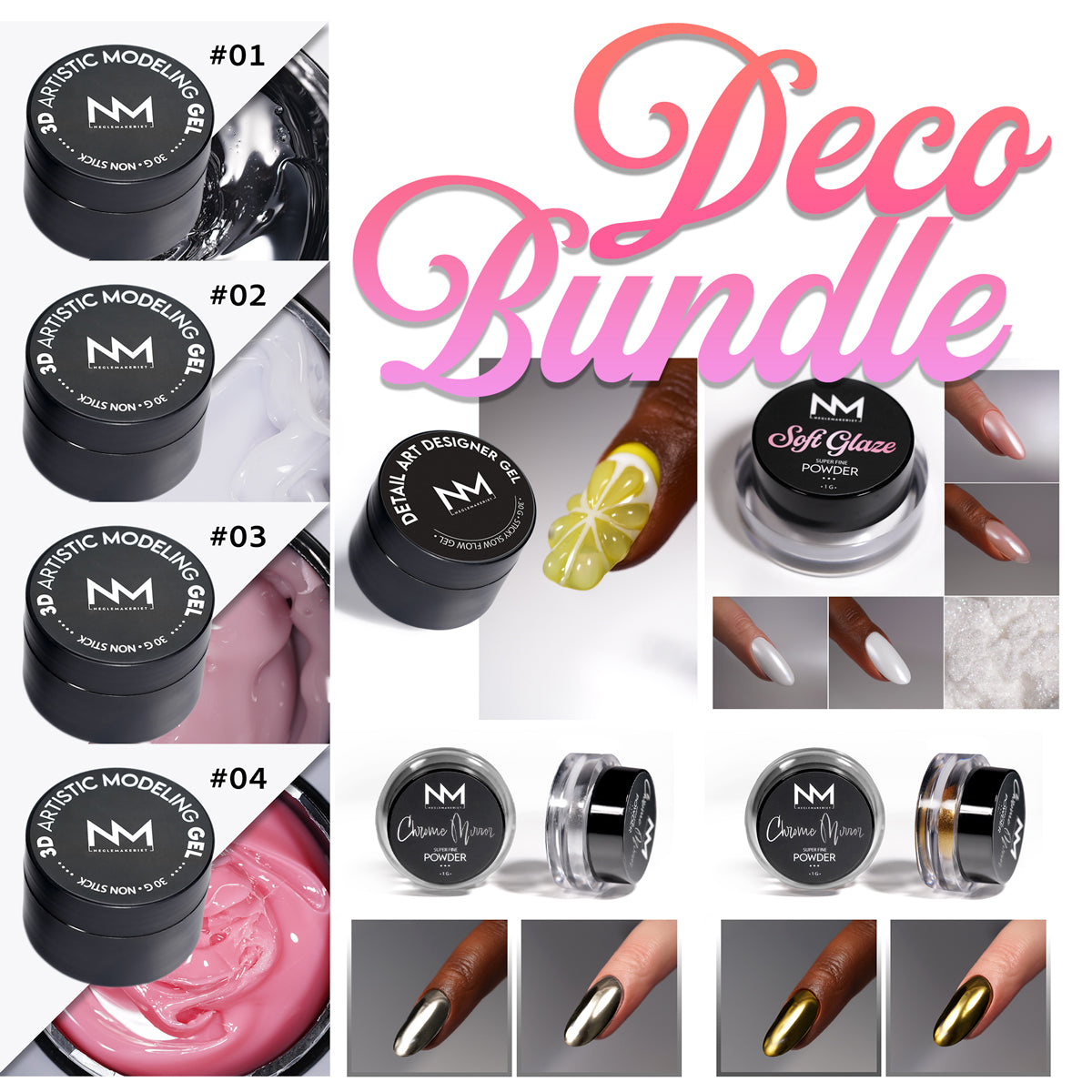 DECO BUNDLE - 3D Gel, Designer Gel, Chrome & Glaze (8 PRODUKTER)